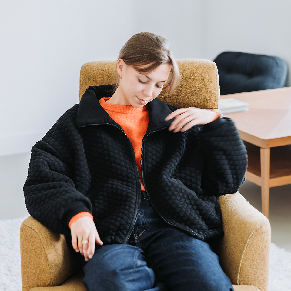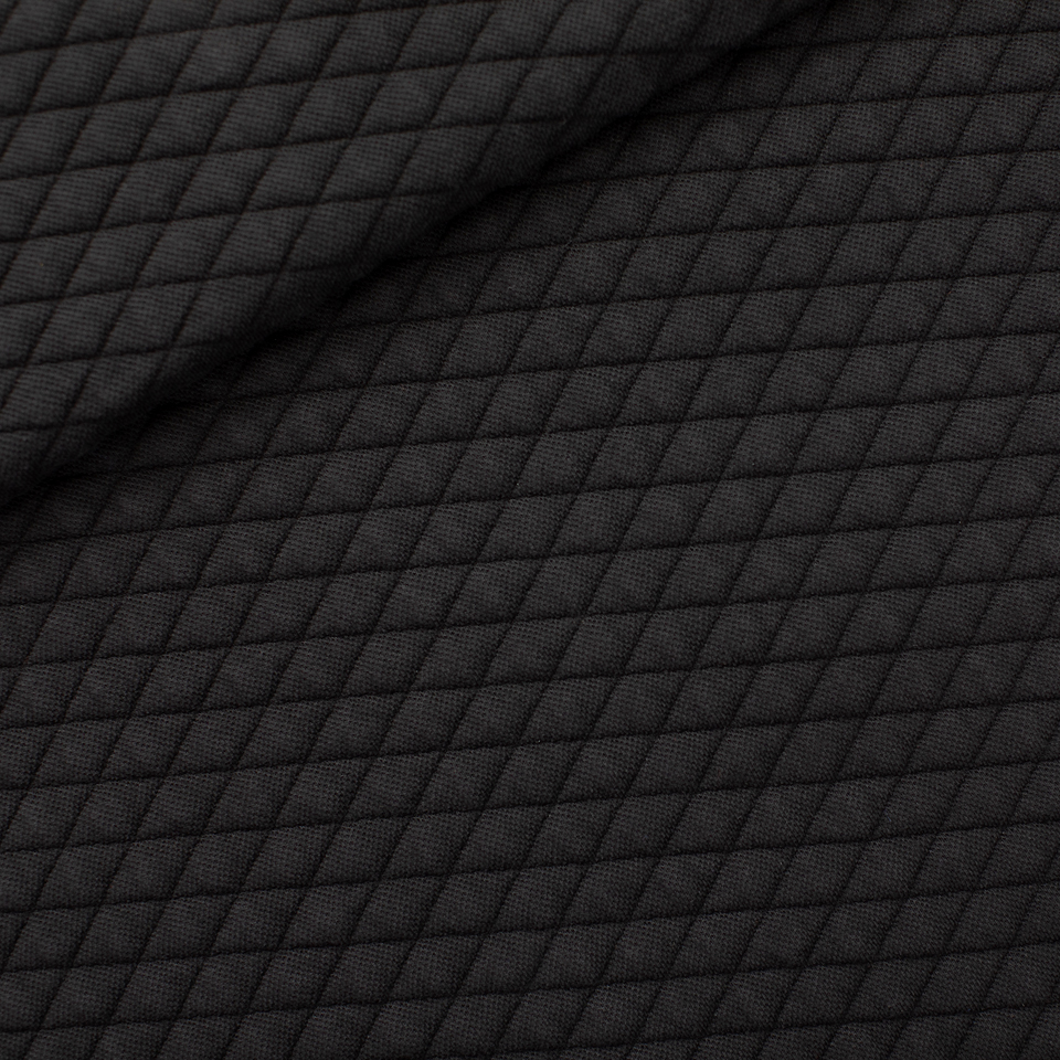 Ce tissu tricoté présente une texture piqué et est rembourré/cousu en matelassage, idéal pour des vestes et pulls élégants.